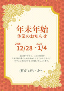 日頃よりご利用いただき誠にありがとうございます。 今年も残すところあとわずかとなりました。 誠に勝手ながら左記の期間は休業とさせていただきます。 ご不便をおかけしますがご理解のほどよろしくお願い申し上げます。 本年もご愛顧いただき誠にありがとうございました。 来年もいっそう皆様のお役に立てるよう尽力してまいりますので、どうぞよろしくお願い申し上げます。 シェアする